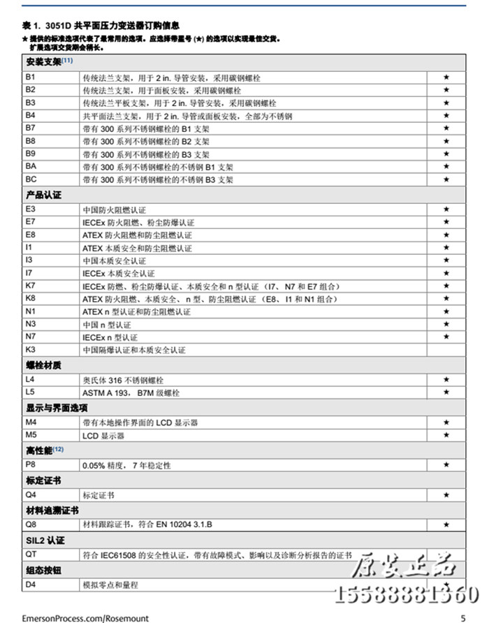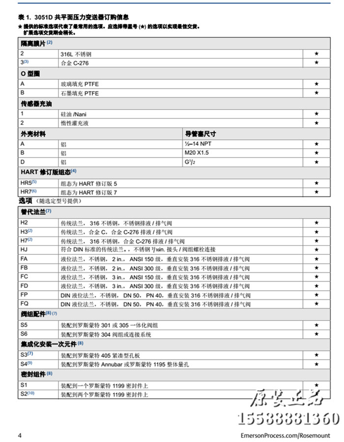 羅斯蒙特3051DG壓力變送器選型列表: